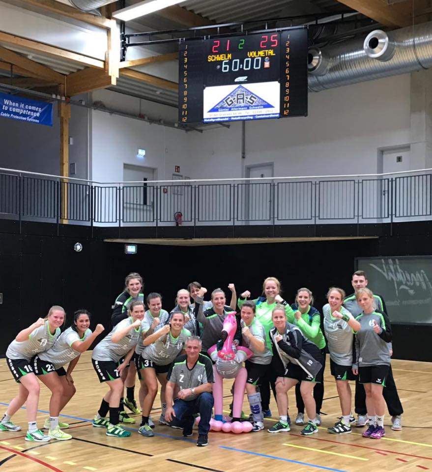 Aber so leicht wollte man sich nicht geschlagen geben. Mit einer Umstellung auf eine defensive 6:0-Abwehr sollten die Räume der agilen Schwelmer Mittelfrau eingeengt und der Bewegungsradius der Kreisläuferin eingeschränkt werden. Dies erwies sich als goldrichtige Entscheidung des Trainers Pascal Binder, denn seine Mädels ackerten bis zum Umfallen und zwangen den Gegner zu Würfen aus dem Rückraum, die entweder am Tor vorbei gingen oder von den Torhüterinnen Carolin Olivier und Saskia Raabe pariert wurden. Und auch im Angriff legten die grün weißen Girls jetzt so richtig los. Von der Mitte aus wurde nun ein Spielzug nach dem anderen eingeleitet, so dass Joelleen Herzog die Damen mit einer Serie von 5 Treffern innerhalb von 8 Minuten mit 12:14 in Führung brachte. Scheiterte man in Durchgang eins noch häufig an der gegnerischen Torfrau, war nun jeder Schuss ein Treffer von allen Positionen. Die Schwelmerinnen versuchten Mitte der zweiten Halbzeit noch mit einer 3:3-Deckung den starken Volmetaler Rückraum im Zaum zu halten- damit besiegelten sie aber ihre eigene Niederlage. Denn nun ließ Alina Jordan nichts mehr anbrennen und erzielte drei Tore von der rechten Außenposition und auch Anja Gierse am Kreis hatte viel Platz am Kreis und holte den ein oder anderen Strafwurf heraus. RE Schwelm hatte dieser geballten Angriffspower nichts mehr entgegenzusetzen und musste sich am Ende mit 21:25 geschlagen geben.