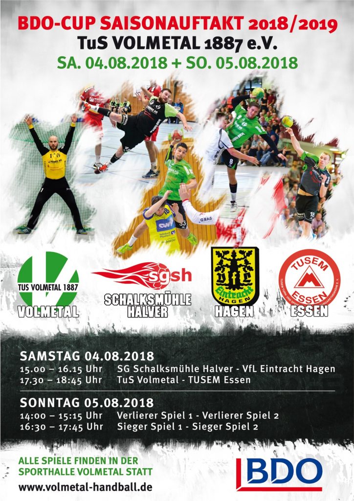 Am kommenden Wochenende lädt der TuS Volmetal erstmalig zum BDO-Cup in die Sporthalle Volmetal ein. Zur Halbzeit der Vorbereitung auf die neue Saison erwartet die heimischen Handballfans ein hochkarätiges Vorbereitungsturnier mit den heimischen Vertretern von Eintracht Hagen, SG Schalksmühle-Halver sowie dem Zweitligisten TUSEM Essen.